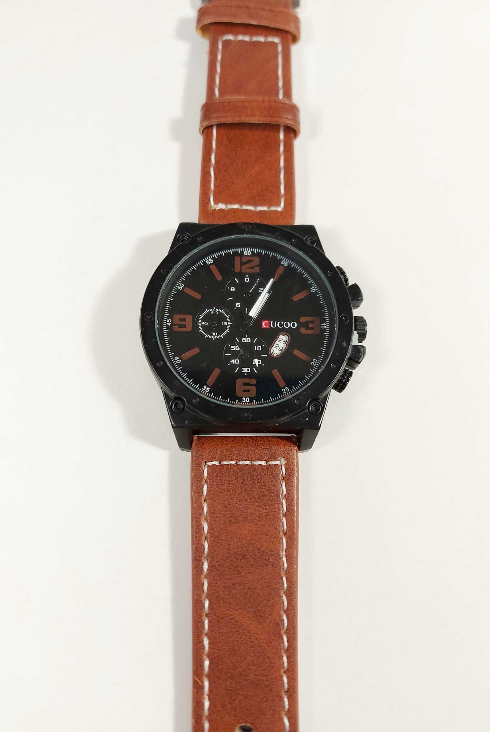 Αντρικό ρολόι με φαρδύ καφέ λουράκι και ανοιχτό καφέ καντράν με μαύρες γραμμές και λευκούς λεπτοδείκτες.
