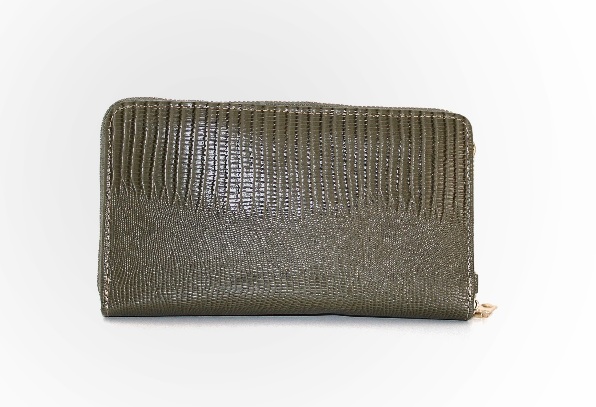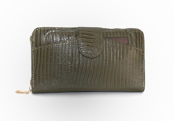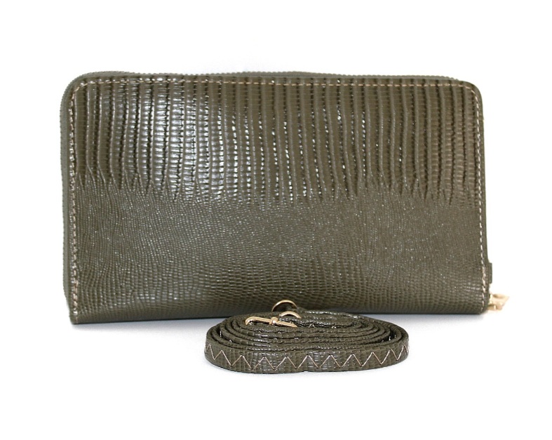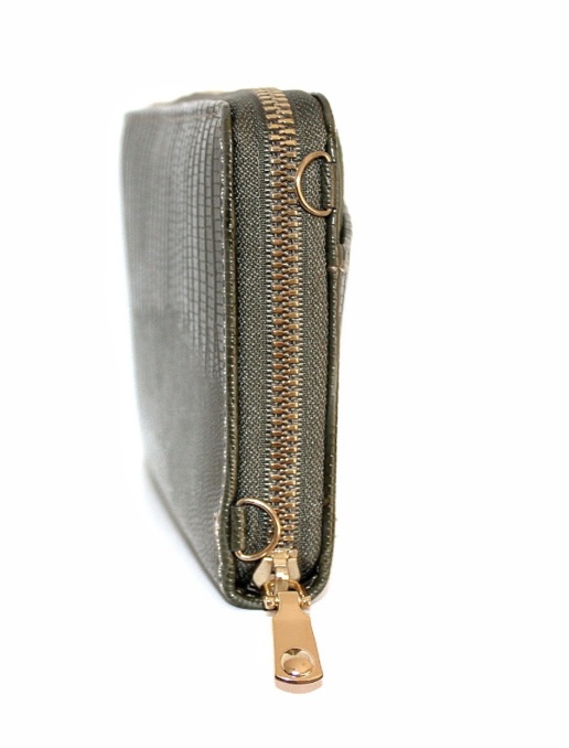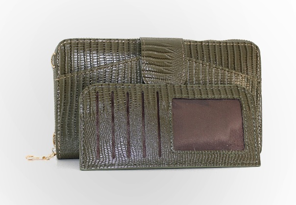 Πράσινο-χακί πορτοφόλι με αποσπώμενη θήκη για κάρτες. Εσωτερικά έχει θήκες για κάρτες, χαρτονομίσματα και θήκη με φερμουάρ για τα κέρματα.