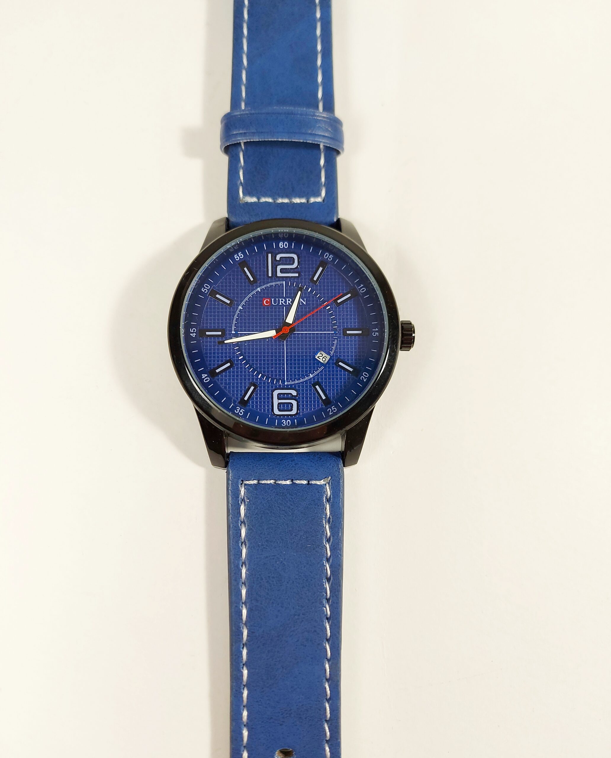 Αντρικό ρολόι σε πολύ μοντέρνο μπλε χρώμα και στο λουράκι και στο καντράν. Έχει ασημένιο πλαίσιο και λευκούς  αριθμούς και λεπτοδείκτες.